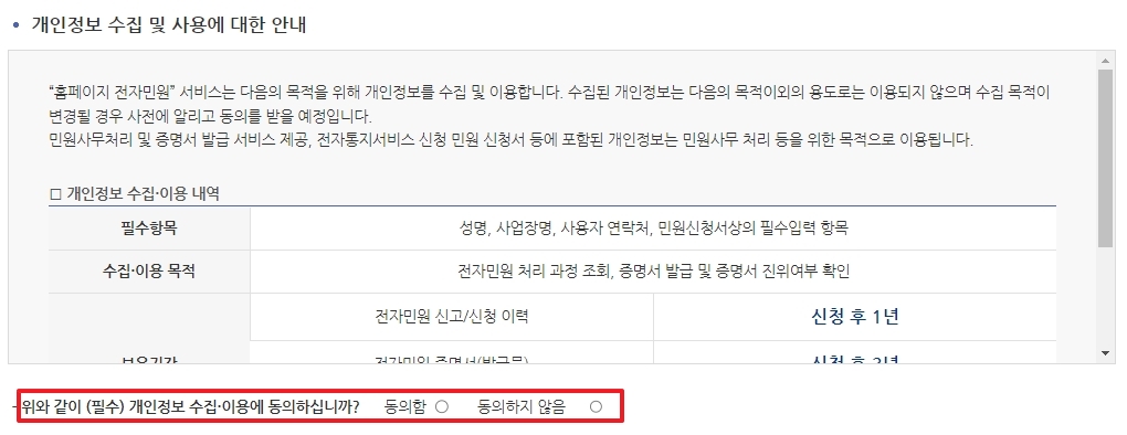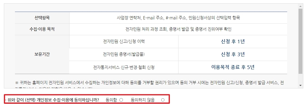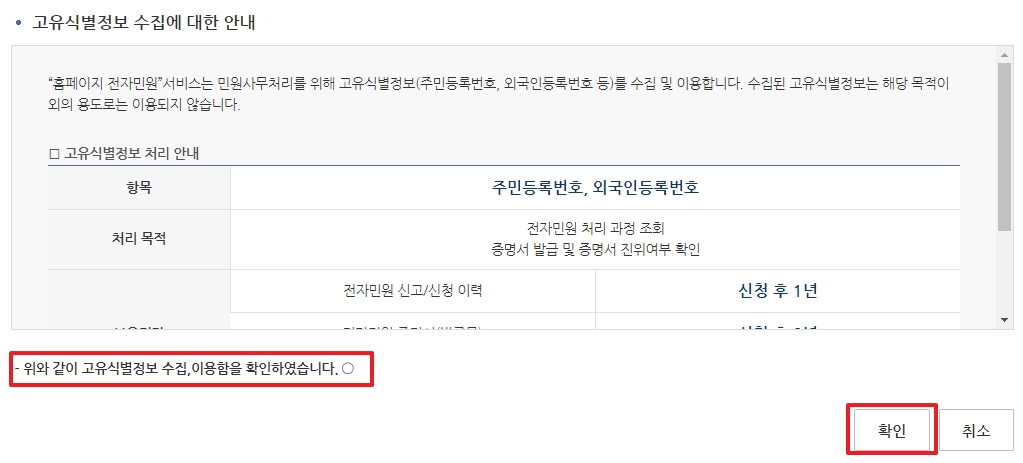 국민연금 가입 증명서 인터넷 발급을 위해서는 개인정보 수집 및 이용에 전부 동의를 해야 발급이 가능합니다. 그렇기 때문에 모두 동의를 누르고 '확인' 버튼을 눌러줍니다.