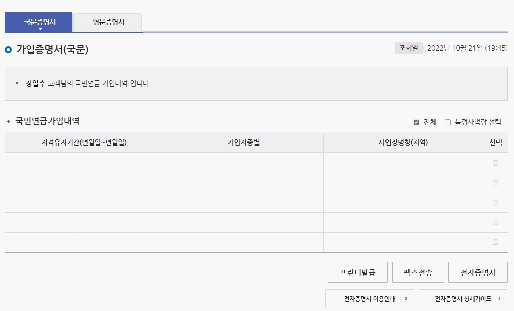 전체 내역 혹은 특정 사업장 내역만을 선택했다면 본인이 원하는 방법을 선택해서 국민연금 가입 증명서 발급을 받으면 됩니다. 인터넷으로 받을 경우 프린트, 팩스, 전자 증명서 중 하나를 선택하여 발급받을 수 있습니다.