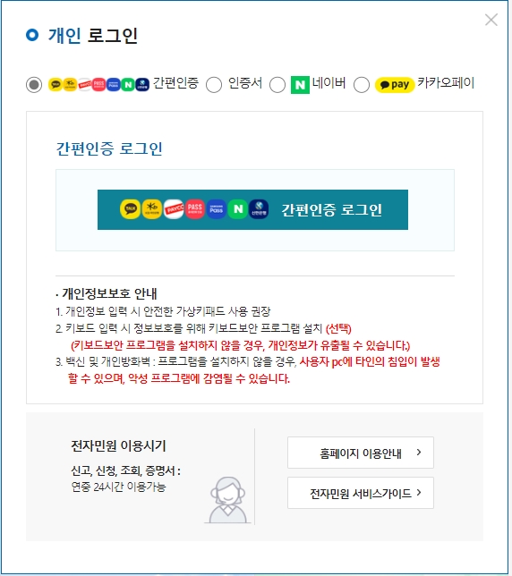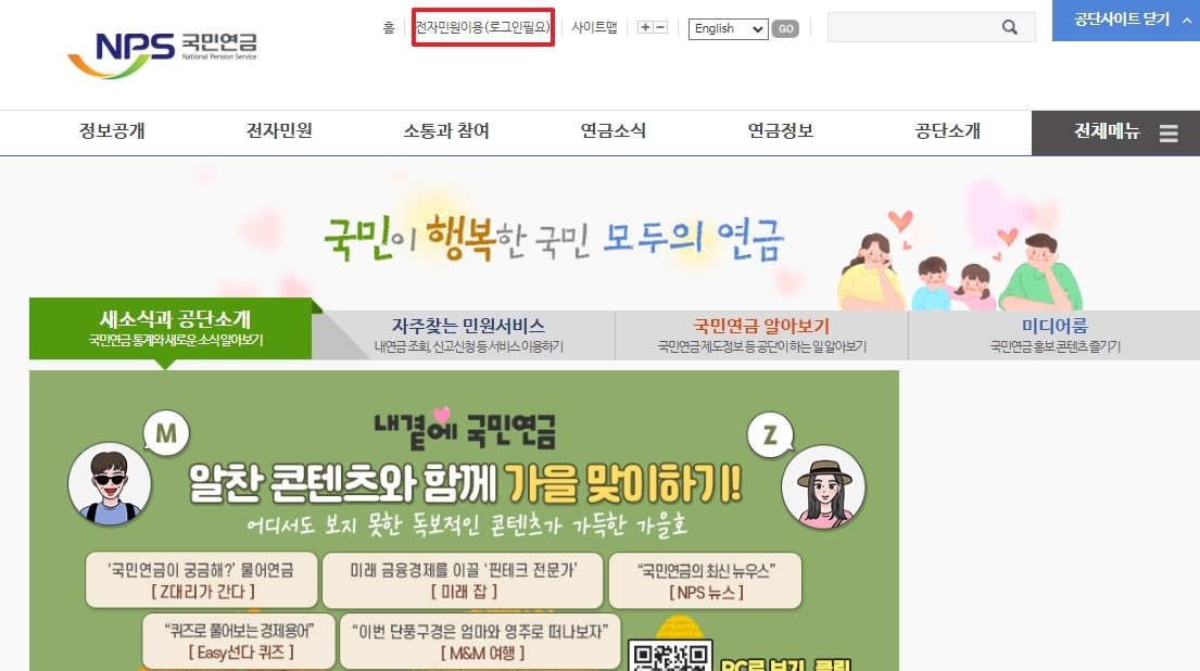 국민연금 가입 증명서 발급을 위해서는 로그인이 필수입니다. 로그인할 때는 공동 인증서 혹은 네이버 인증, 카카오페이 인증 등 본인이 편한 방법을 사용하여 로그인을 합니다. 그리고 다시 국민연금 홈페이지 메인화면으로 돌아옵니다.