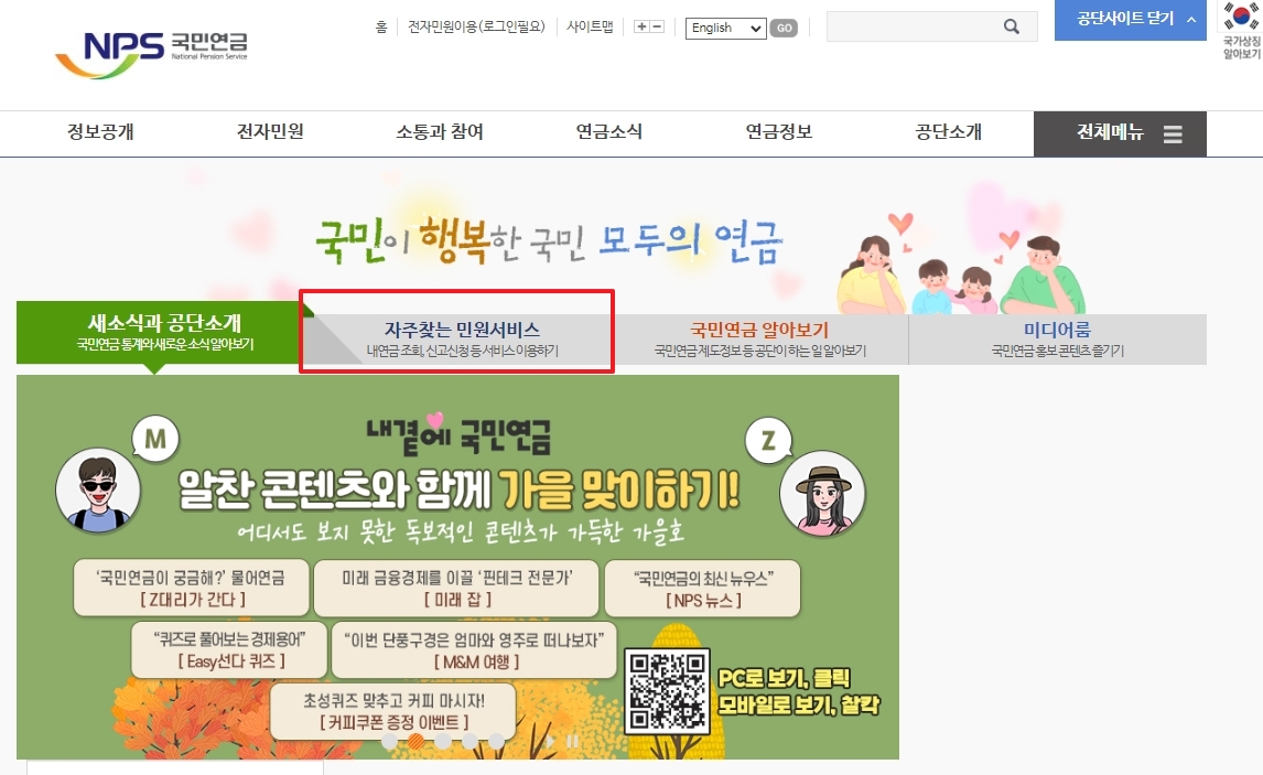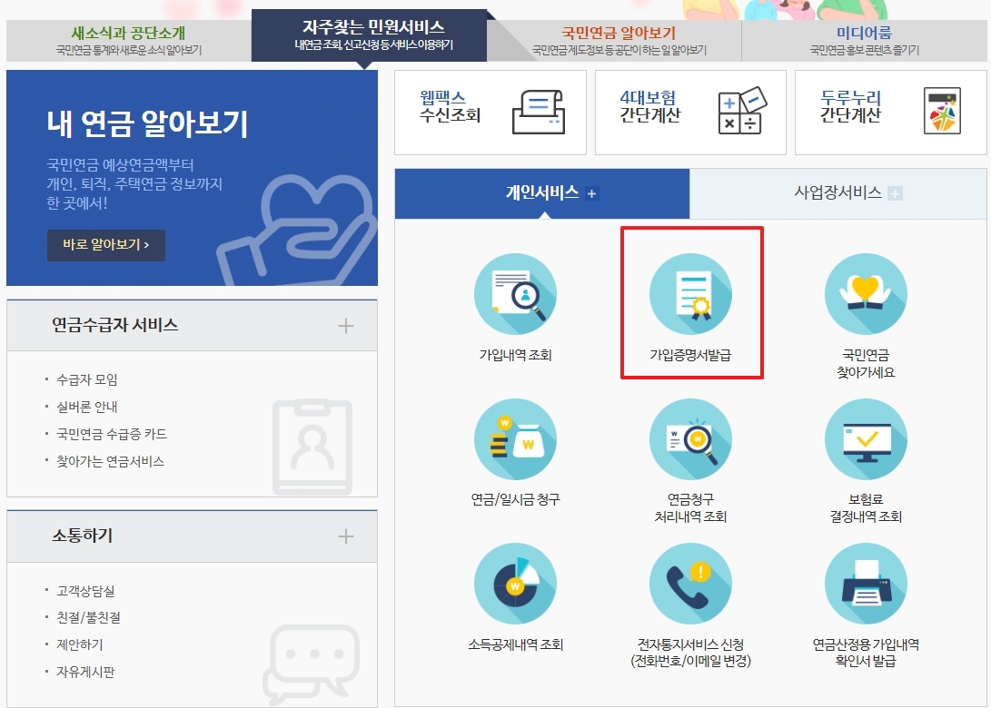 국민연금 홈페이지 메인화면에 '자주 찾는 민원서비스'를 클릭하고 '가입증명서 발급' 메뉴를 눌러줍니다.