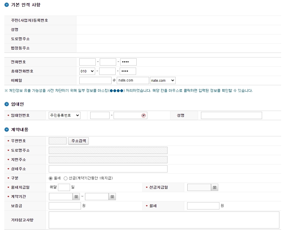 마지막으로 기본적인 인적 사항과 임대인의 개인정보와 계약 내용 등을 입력하여 줍니다. 이때 임대인의 주민등록번호와 이름이 필요한데 월세 계약서에 나와있으니 보고 입력하면 됩니다. 처음에 말했듯이 월세 소득공제를 위해서 현금 영수증 신청하는 것을 집주인에게 허락 및 동의를 구할 필요가 없기 때문에 걱정하지 않으셔도 됩니다. 신청 정보들을 입력했다면 '등록하기' 버튼을 누르면 끝입니다.