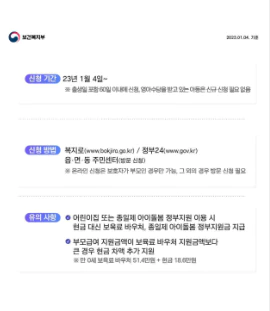 신청방법은 주소지의 읍, 면, 동 주민센터에서 하거나 복지로, 정부 24, 누리집 사이트를 이용하여 신청할 수도 있습니다. 아이의 부모가 신청을 한다면 주소지와 무관하게 전국 주민센터에서 신청을 할 수 있으며, 온라인으로 신청할 경우에는 부모인 경우에만 신청이 가능합니다.