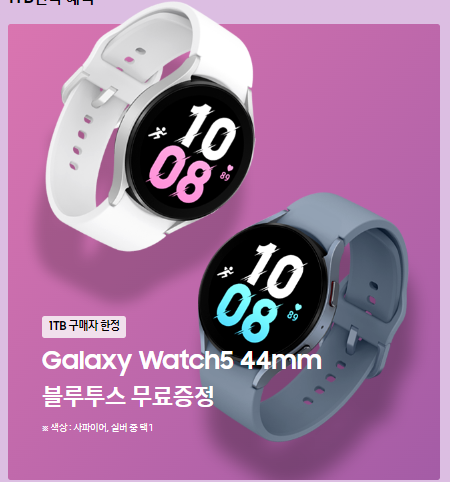 또한, 현재 쿠팡에서는 갤럭시 S23 사전예약 시 256GB 제품만 있지만 삼성닷컴에서는 1TB도 구매가 가능합니다. 거기에 더불어 1TB 구매자 한정 갤럭시 워치 5 44m 블루투스 제품 무료 증정 혜택까지 있습니다.
