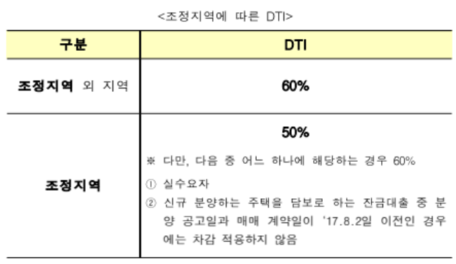 - DTI: 최대 60% 이내. 단, 주택의 소재지가 조정지역일 경우에 10%p 차감하여 적용