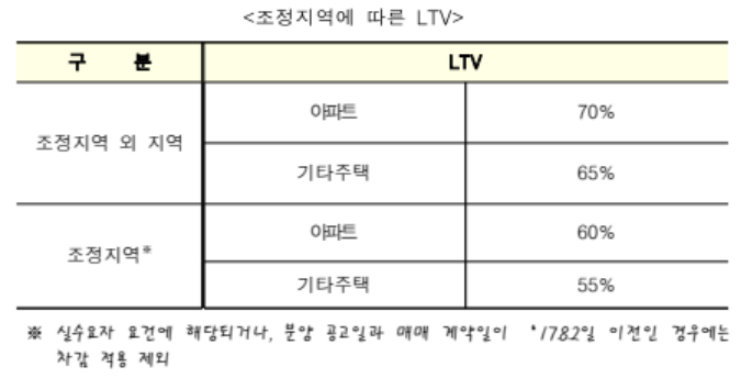 - LTV: 아파트는 70%, 기타 주택은 65% 이내로 주택의 소재지가 조정지역일 경우에는 유형별로 10%p씩 차감하여 적용