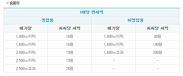 자동차세 납부를 위해서는 자동차세의 경우 배기량, 차종, 차령에 따라 달라지는 금액을 알아야 합니다. 승용차의 경우 영업용은 1,000cc 이하는 cc당 18원, 1,600cc 이하~2,500cc 이하는 19원, 2,500cc 초과는 24원입니다. 비영업용의 경우 1,000cc 이하 80원, 1,600cc 이하 160원, 1,600cc 초과 600원으로 계산됩니다.