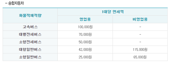 승합자동차의 경우 영업용은 고속버스 10만 원, 대행전세버스 7만 원, 소형전세버스 5만 원, 대형일반버스 4만 2천 원, 소형일반버스 2만 5천 원입니다. 비영업용의 경우 대형일반버스는 11만 5천 원, 소형일반버스 6만 5천 원입니다.