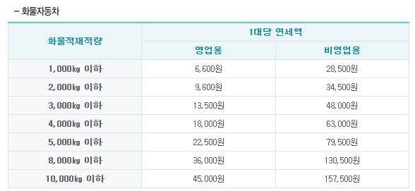 화물자동차의 경우 영업용 1,000kg 이하 6,600원, 2,000kg 이하 9,600원, 3,000kg 이하 13,500원, 4,000kg 이하 14,000원, 5,000kg 이하 22,500원, 8,000kg 이하 36,000원, 10,000kg 이하 45,000원입니다. 비영업용의 경우 1,000kg 이하 28,500원, 2,000kg 이하 34,500원, 3,000kg 이하 45,000원, 4,000kg 이하 63,000원, 5,000kg 이하 79,500원, 8,000kg 이하 130,500원, 10,000kg 이하 157,500원입니다.
