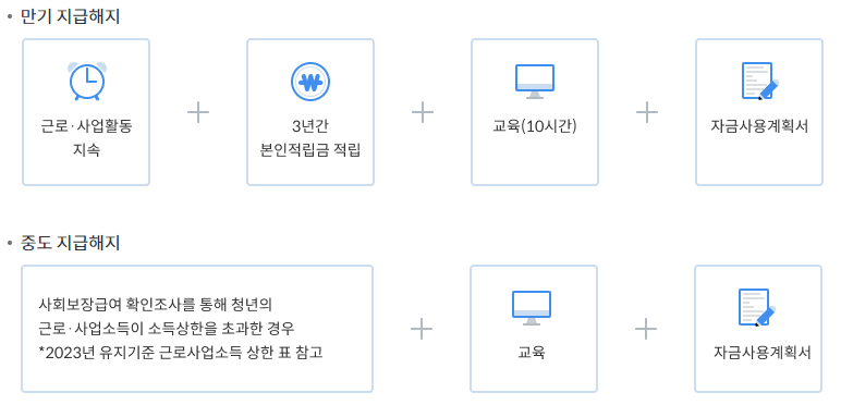 두 번째는 3년간 근로활동을 지속해야 합니다. 만약 근로활동을 하고 있지 않다면 환수해지가 되며, 시군구에서 가입자에게 통보한 날을 기준으로 1개월 내 가입자가 소명할 경우에는 청년내일저축계좌 유지가 가능합니다. 또한, 가입 후 3개월 이내의 가입자는 대상에서 제외됩니다.