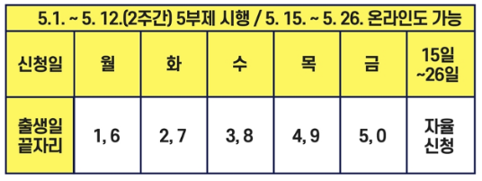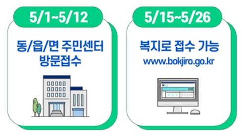 복지로 온라인 신청의 경우 5월 15일부터 26일까지 신청이 가능하고 오프라인 신청의 경우 5월 1일부터 26일까지 신청이 가능합니다. 오프라인 신청의 경우 신청시작 2주 동안은 출생일자를 기준으로 5부제를 시행하며, 5일의 경우에는 공휴일이기 때문에 신청이 불가능합니다. 그래서 출생일 끝자리가 5, 0인 경우에는 4일 혹은 12일에 신청을 해야 합니다.