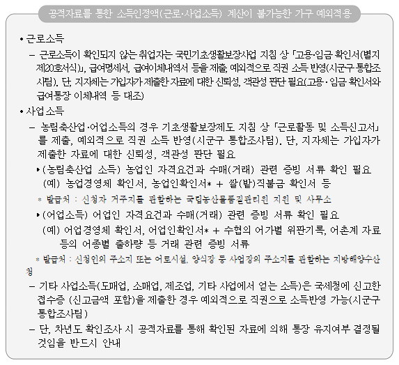 소득인정액이 기준 중위소득 100% 이하여야 하고 소득은 공적자료 기준으로 합니다. 공적자료로 소득 확인이 불가능한 경우에는 소득에서 제외됩니다.