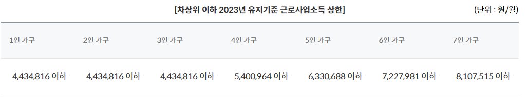 가구재산의 경우 기준 중위소득에 관계없이 대도시 3.5억 원, 중소도시 2억 원, 농어촌 1.7억 원 이하입니다.