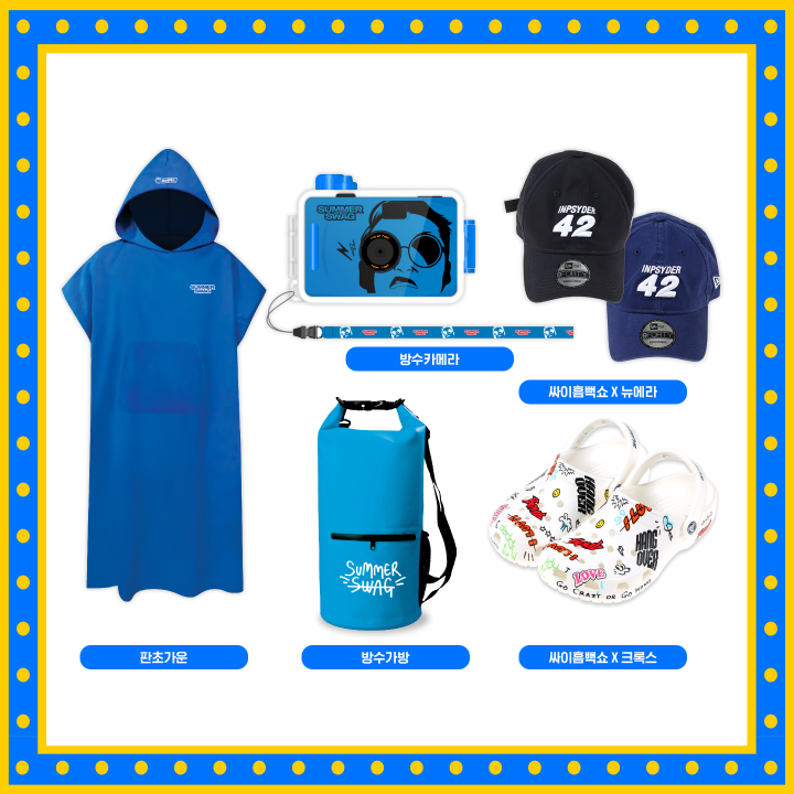 싸이 흠뻑쇼하면 굿즈를 빼놓을 수 없습니다. 기본적으로 싸이 흠뻑쇼에를 관람하는 모두에게 우비와 비닐백팩을 지급하고 PSYlight(LED 너클밴드)도 함께 제공되기 때문에 별도의 응원봉이 필요 없이 공연을 즐길 수 있습니다. 굿즈의 경우 판초가운, 방수카메라, 뉴에라 모자, 방수가방, 크록스, 투명고글, 타월, 방수팩, 타투스티커세트, 티셔츠 등으로 구성되어 있습니다.