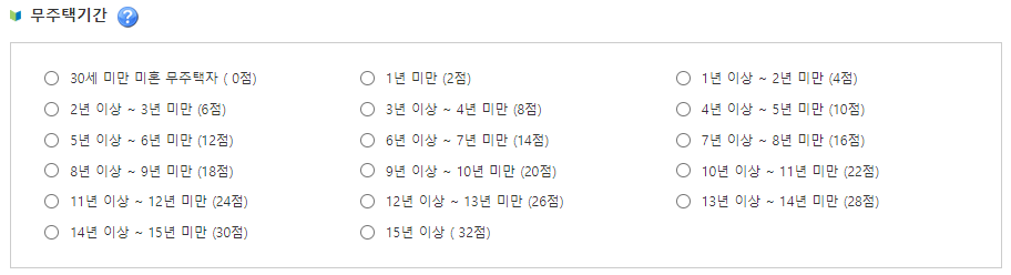 그다음은 무주택기간인데 기본 2점으로 시작해 무주택기간이 1년 늘어날 때마다 2점을 얻을 수 있고 최대 32점을 얻기 위해서는 15년 이상 무주택 상태여야 합니다.