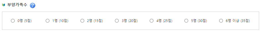 청약점수 계산에는 3가지 항목이 있습니다. 무주택기간(32점), 부양가족수(35점), 청약통장 가입기간(17점)으로 가산점이 가장 큰 항목은 부양가족수입니다. 기본 5점이 주어지고 1인당 5점으로 만점을 받기 위해서는 6명의 부양가족이 있어야 만점을 받을 수 있습니다. 이 부분에서는 좀 더 가점을 받기 위해 부모님을 부양가족으로 두기도 합니다.